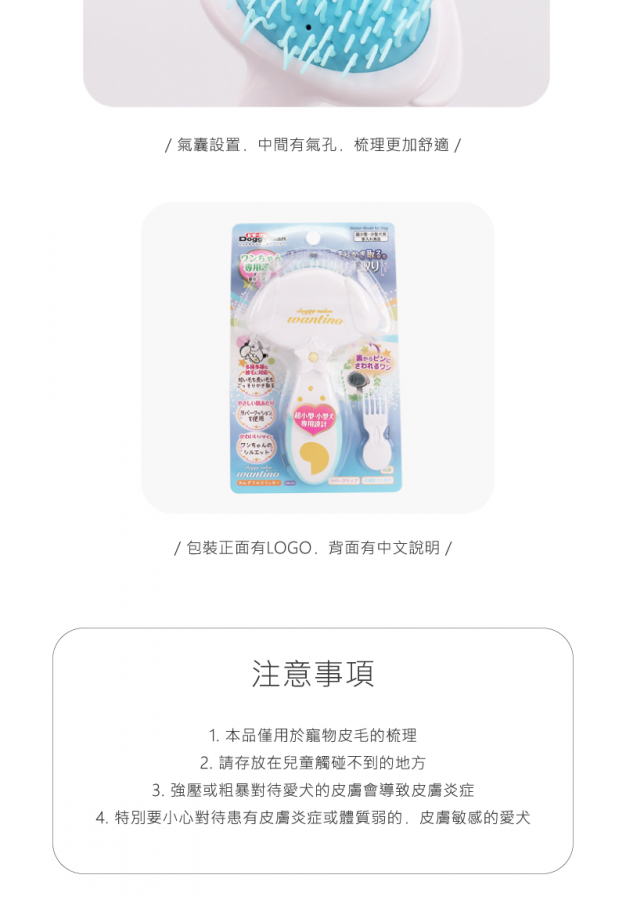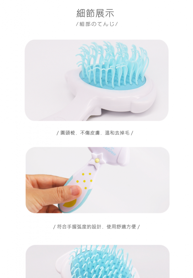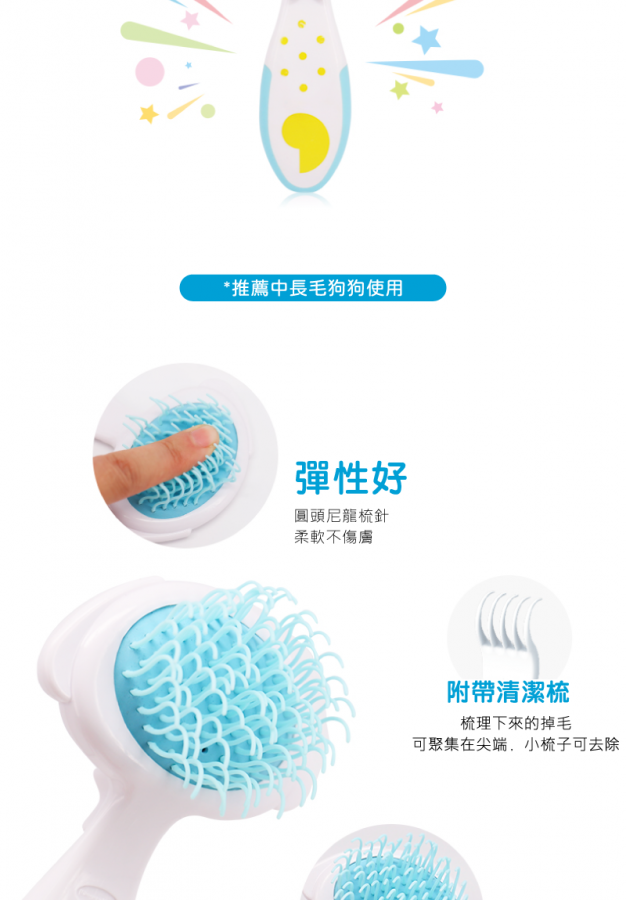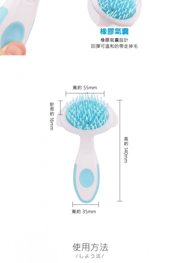 .本產品的細梳針用於寵物掉毛的清理,短的梳針清理表層被毛,長梳針可以深入被毛根部進行清理。