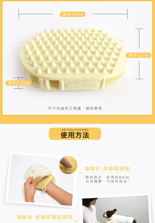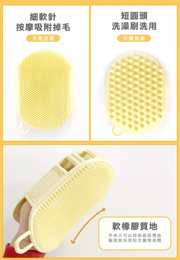 .軟橡膠質地,手伸入可以控制刷面彎曲幅度,能有效貼合寵物身體。