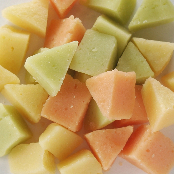 | 原材料 | 起司,澱粉,小麥粉,明膠,植物油脂,蔬菜(西紅柿,菠菜),甘油,礦物質(鈣),丙二醇,多醣,防腐劑(山梨酸鉀,脫氫乙酸鈉),酸化劑,乳化劑,著色劑(β-胡蘿蔔素,二氧化鈦,紅色106,黃色4,黃色5,藍色1),抗氧化劑(異抗壞血酸鈉),香料。 |