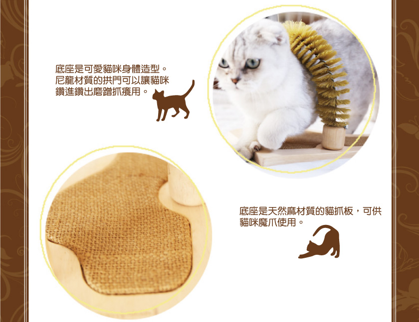 ・讓喵星人充滿享受的磨蹭磨蹭,刷子前端加入了貓咪最愛的木天蓼,貓咪鑽過同時按摩皮膚,倘佯在抓癢般爽快感中~