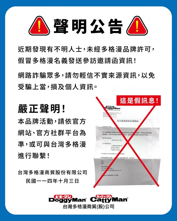 近期發現有不明人士,未經多格漫品牌許可,假冒多格漫名義發送參訪邀請函資訊!