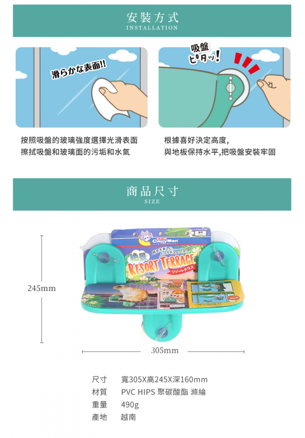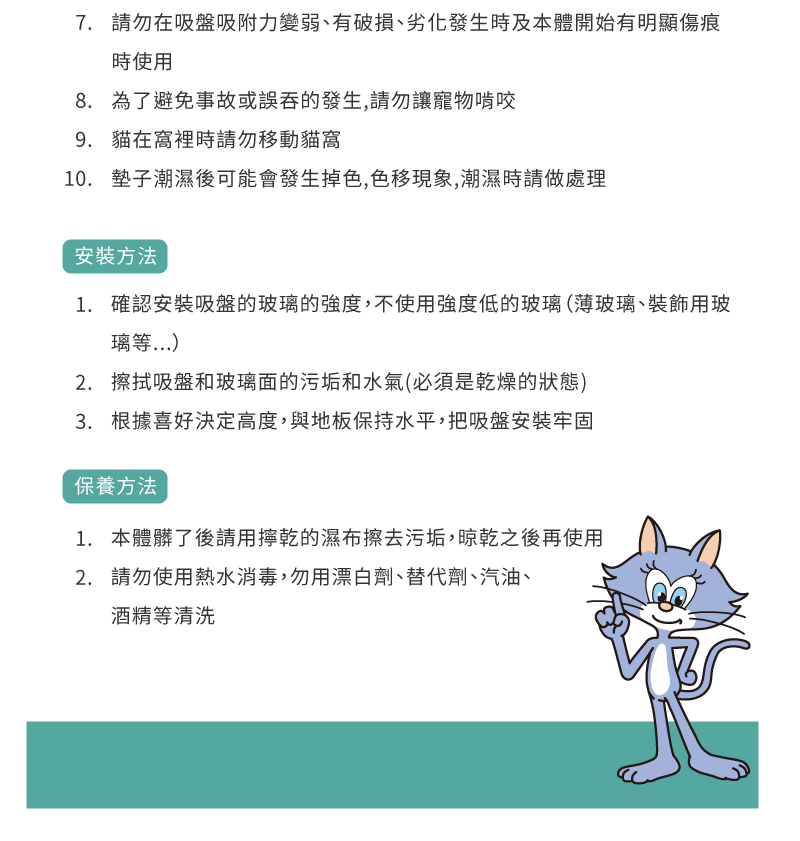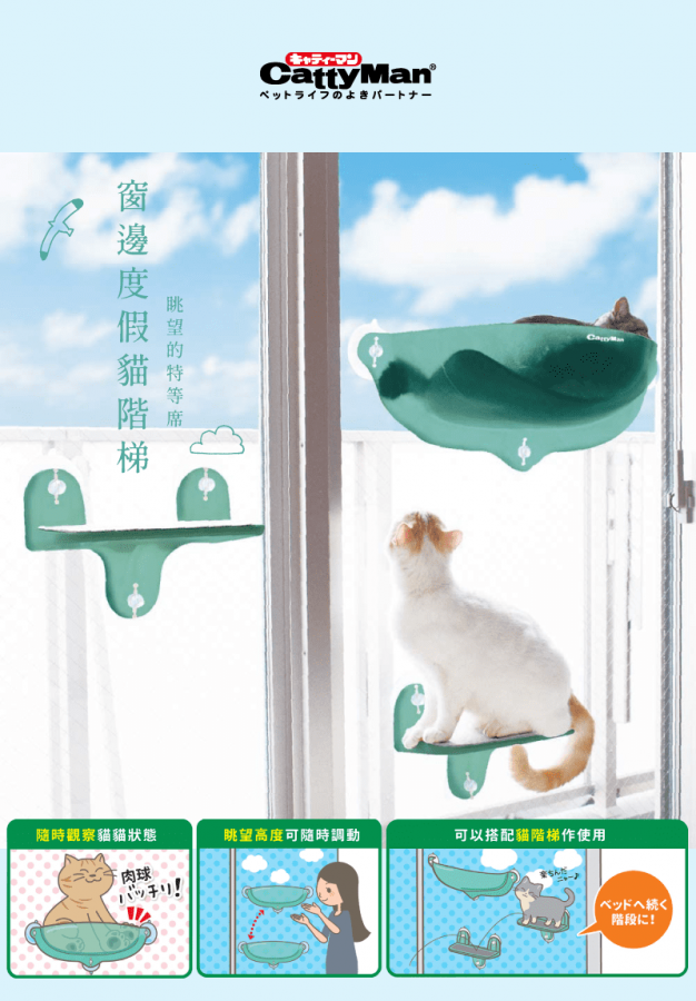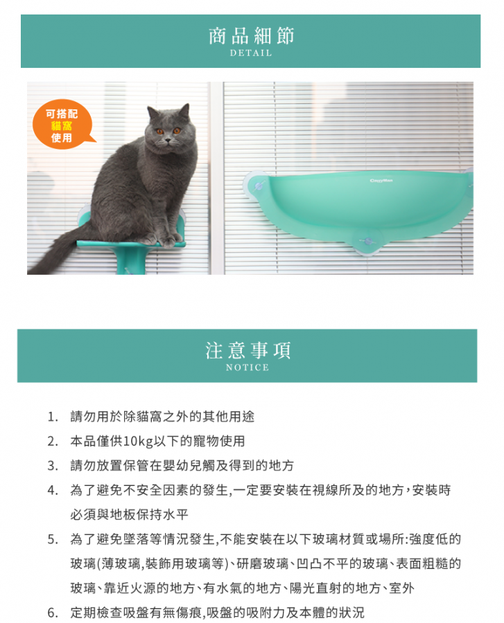 讓貓咪盡情挑望窗外風景 ,乘載建議10公斤內,可黏貼於玻璃上,另有貓窩組可搭配、可自由安插高度。