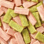 | 原材料 | 小麥粉、肉類(雞柳、雞肉)、糖、起司、明膠、蔬菜(地瓜、菠菜)、脫脂奶粉、甘油、丙二醇、色素(二氧化鈦、黃4、黃5、藍1、紅106)、山梨糖醇、防腐劑(山梨酸鉀)、礦物質(鈉)、pH調節劑、膨鬆劑、抗氧化劑(維生素E)、調味劑 |