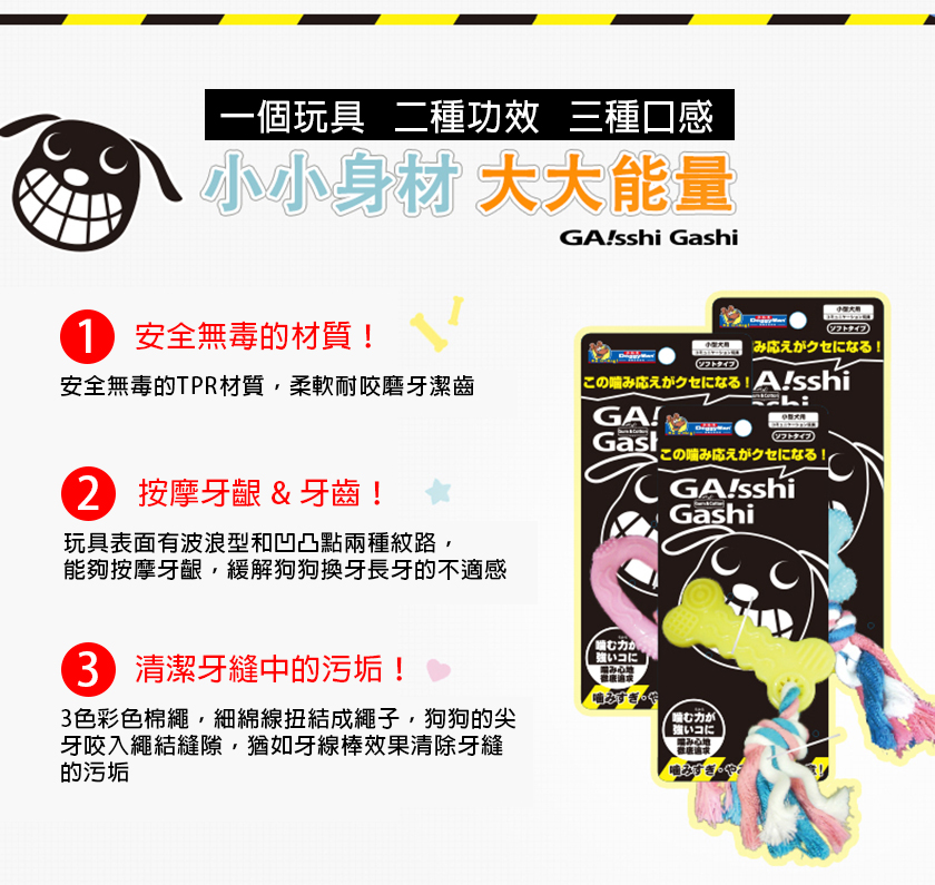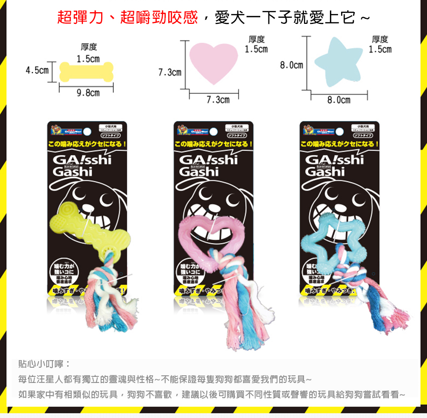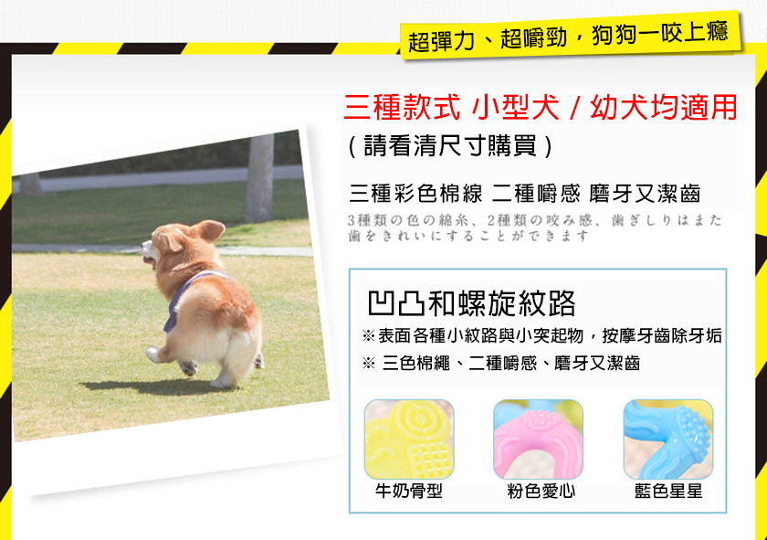 可愛的外形下是柔韌耐咬的合成橡膠,三款顏色特別小清新,搭配上3色彩棉繩增添甜美感。表面各種小紋路和小突起,棉繩又是另一種咬感,同樣都能按摩牙齒的同時幫助愛犬去除牙垢,兩種咬感,讓愛犬感到趣味無窮。