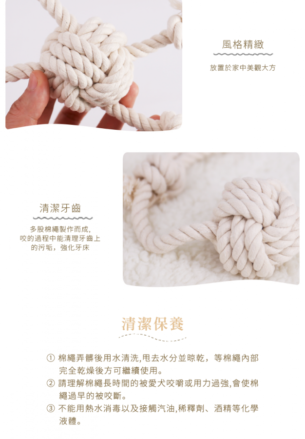100%純棉材質,更安心、親膚的狗咬玩具!一個棉球上發出4根棉繩,增強了愛犬玩耍的趣味性。邊玩邊咬過程中,加固牙床。主人和愛犬一起玩耍,消除壓力和運動不足,同時對愛犬進行訓練和教育。