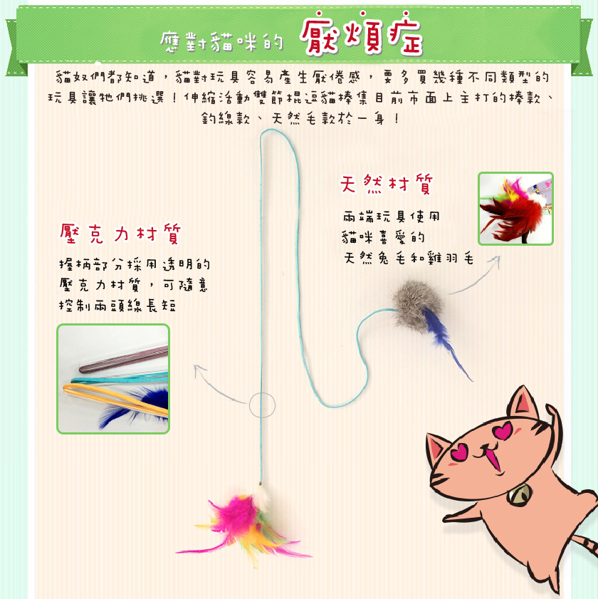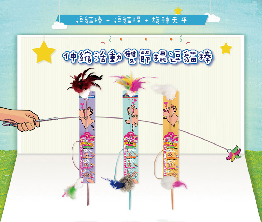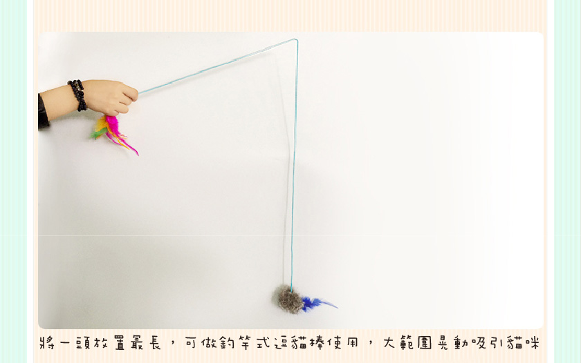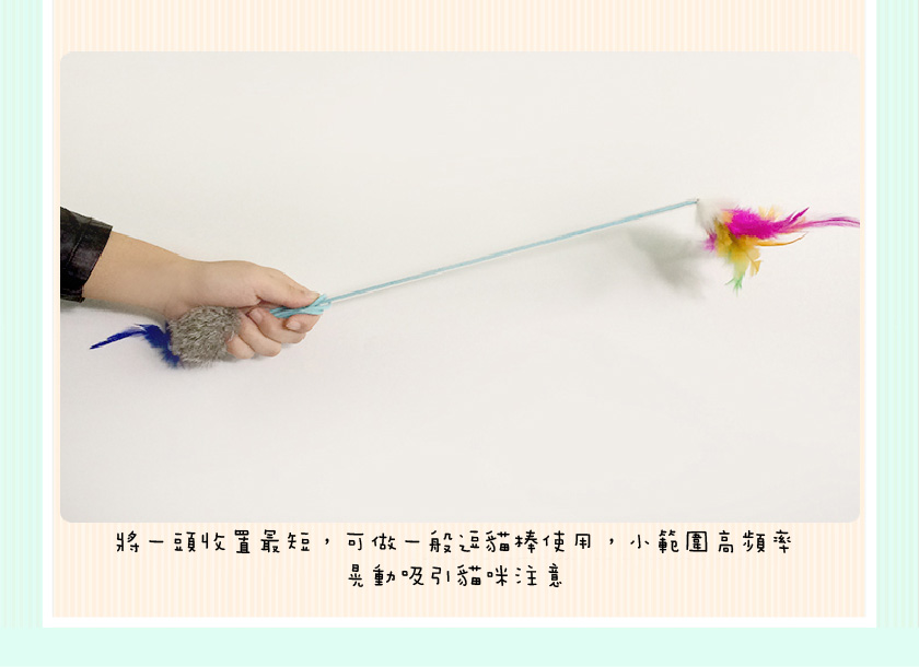 ● 桿頭線繩加長揮舞:以兔毛、雞羽毛設計的桿頭,將桿頭線繩加長,如蝴蝶翩翩般豪爽的揮舞出不同姿態,讓喵星人目不暇給。