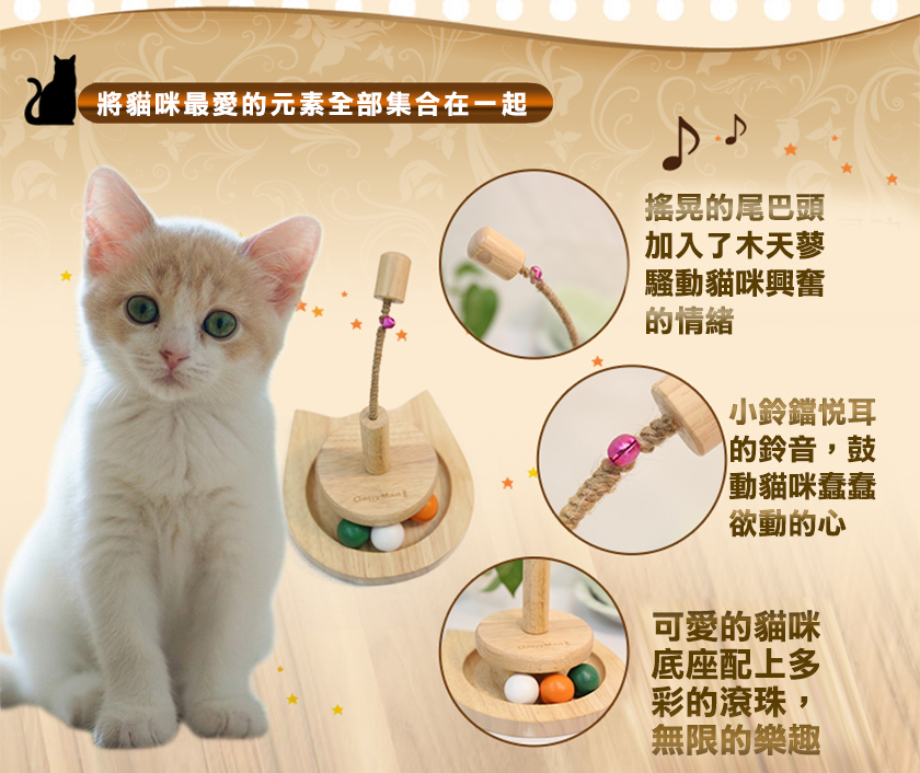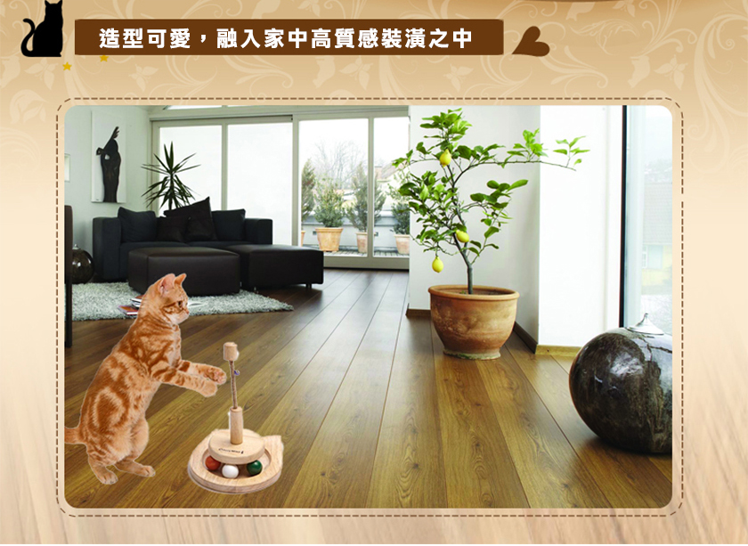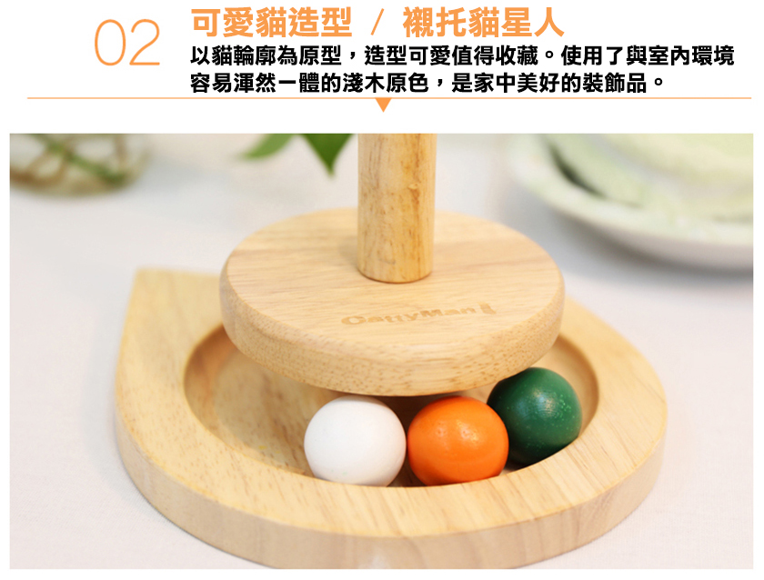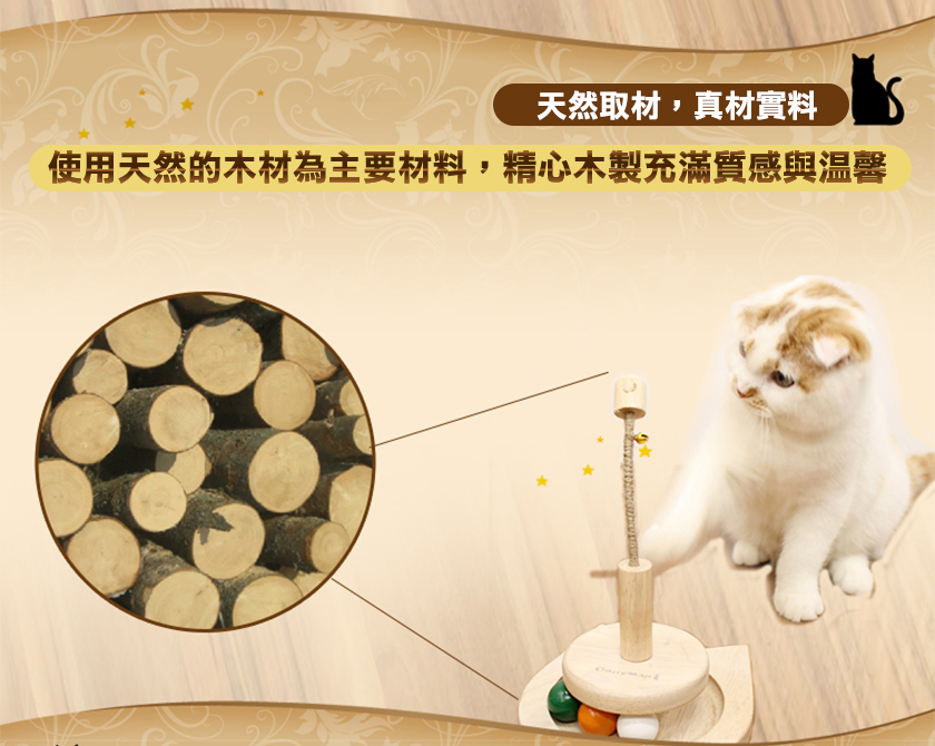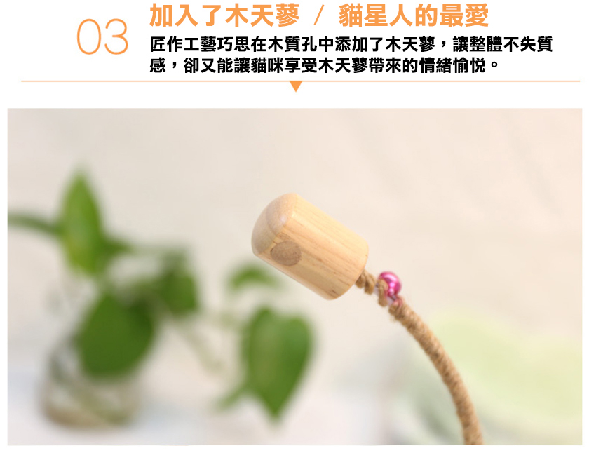 本產品採用天然木頭和麻繩,貼合了現代人的木製家居裝修風格,融合了好奇寶寶的本能,與貓咪喜歡捕捉移動物品的天性,加裝了小鈴鐺與木天蓼,美觀與實用性兼具的優雅家居貓玩具。