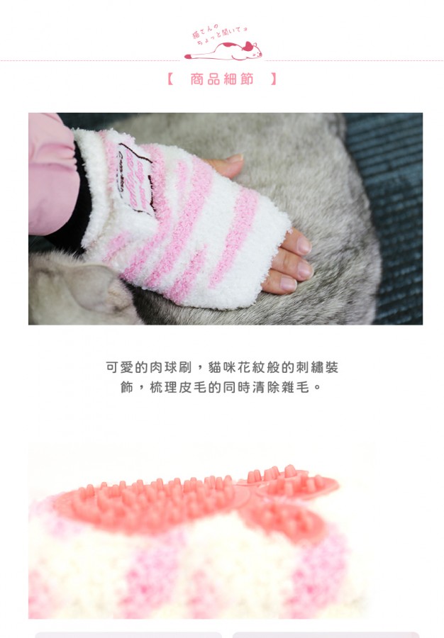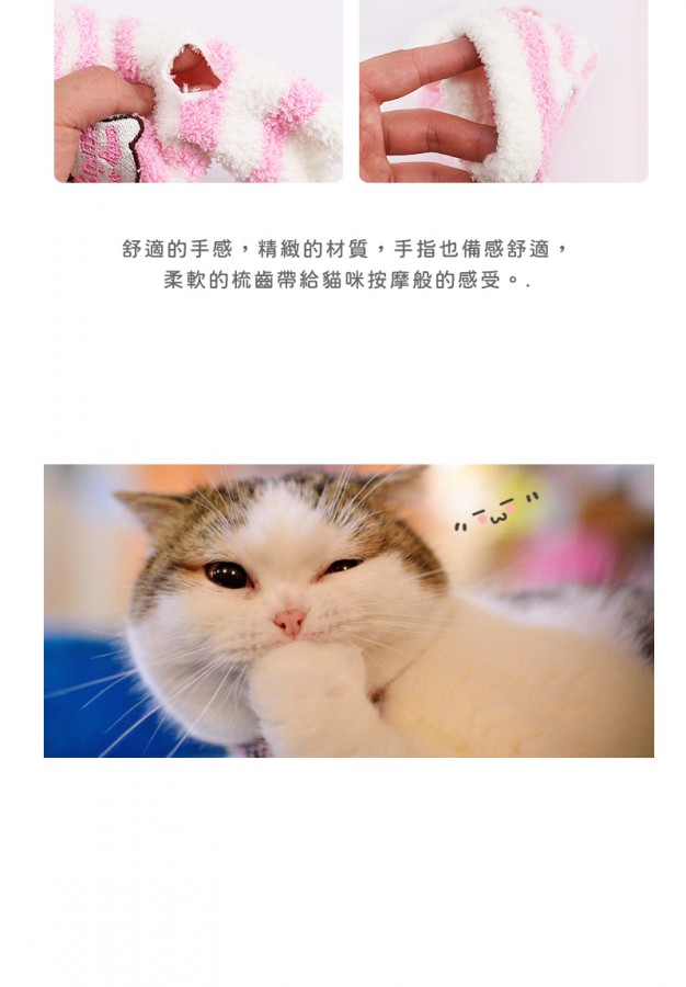 ・超可愛的梳理手套,方便主人套在手上使用,能幫貓咪按摩順便梳理毛髮!