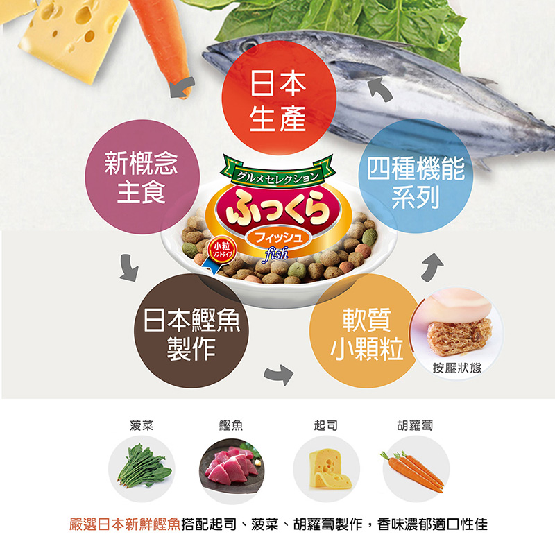 *嚴選鰹魚搭配菠菜和胡蘿蔔及起司、濃郁香味、鬆軟可口、嗜口性佳。