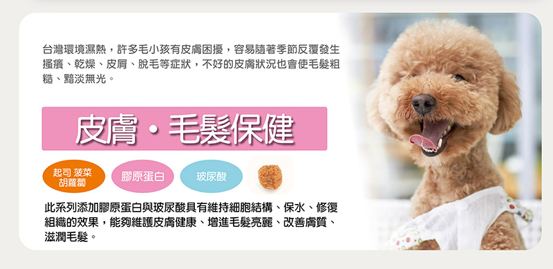 *添加膠原蛋白和玻尿酸成分、呵護毛孩皮膚、使毛髮亮麗、是滋養毛髮的頂級主食配方。