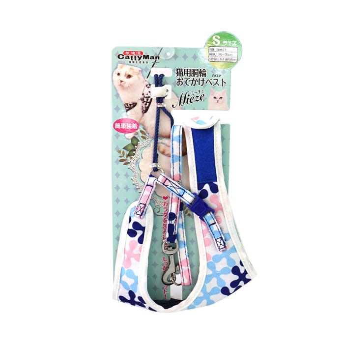 即使貓咪從脖子綁帶掙脫,環繞腰圍的黏扣帶也不易脫落。 牽繩的內裡使用透氣性良好的面料,溫和善待貓咪的肌膚。